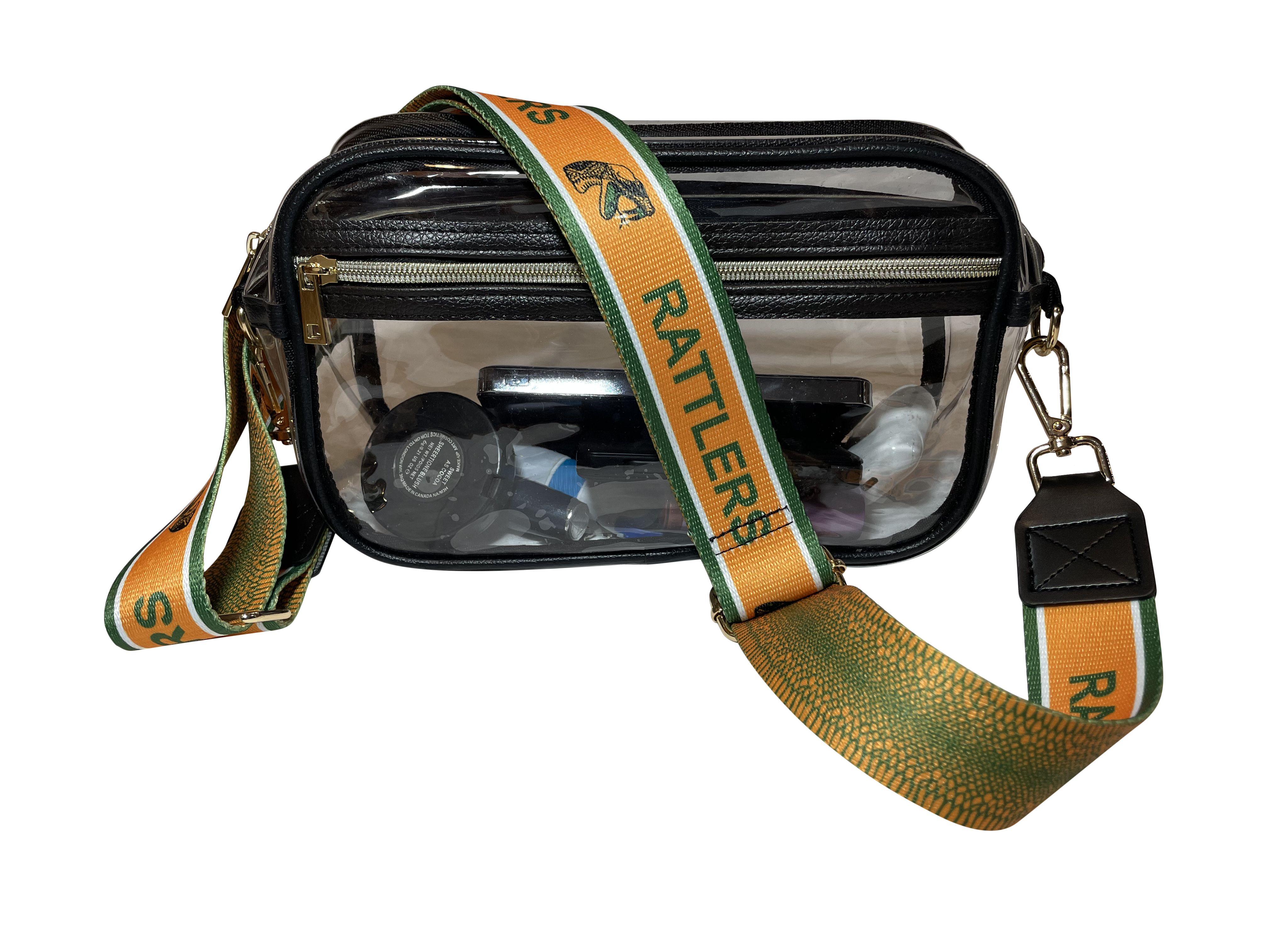 The front proudly displays the iconic Strike logo and bold “Rattlers” text, while the back showcases eye-catching green and orange snake-skin detailing. Tough yet comfortable, this versatile strap easily attaches to your favorite handbags, tote bags, purses, clutches, and accessory wallets.